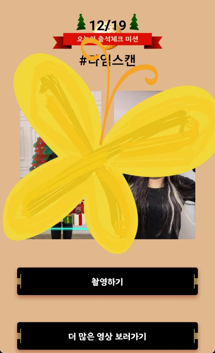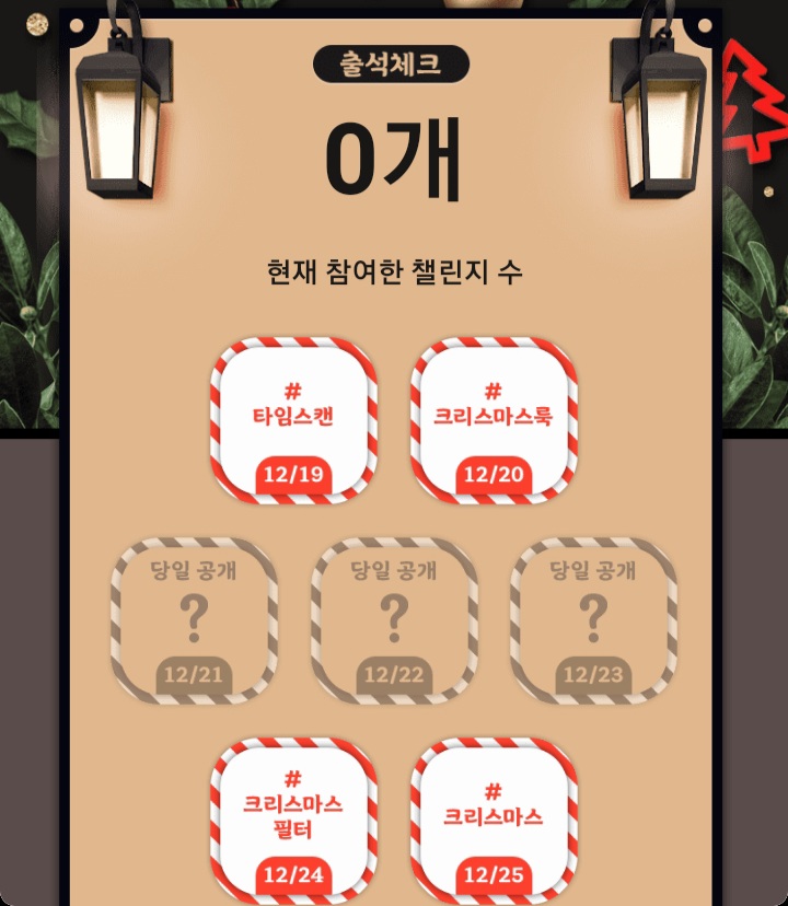원래 그 당일 것만 챌린지가 뜹니다. 12월 19일에는 타임스캔을 해야 미션에 참여가 되었고, 12월 20일에는 크리스마스룩이 틱톡 크리스마스 챌린지로 떴네요. 하지만 페이지를 들어가다 보면 미세하게 어떤 미션이 나오는지 보였습니다.