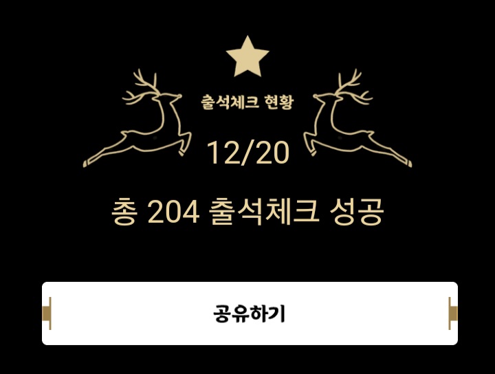 12월 20일 틱톡은 204명이 출석체크를 성공했네요. 7회를 다 채우지 못했어도 5회만 채워도 3등 크리스마스 출석체크 이벤트에는 참여가 가능하니 확인하고 도전 해보면 될 것 같아요.