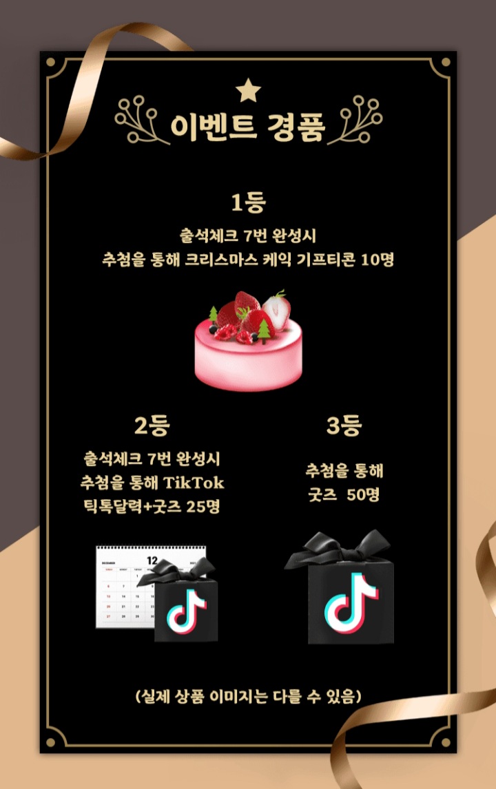 출석체크 미션을 모두 성공하면 (7번) 추첨을 통해서 크리스마스 케익 기프티콘 10명에게 주네요. 2등은 출석체크 7번 완성시 추첨을 통해서 틱톡 달력과 굿즈 25명에게 준다고 합니다. 3등은 굿즈만 50명이네요. 간단하게 매일 꾸준히 참여해보면 좋을 것 같아요 ^^