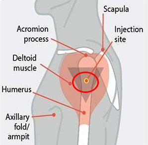 삼각근에 주사하도록 권장되어 있습니다.