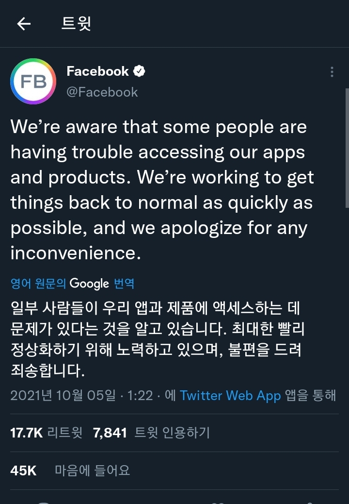 페이스북 트위터 공식 계정에서 트위터로 페이스북이 왓츠앱과 인스타그램이 되지 않는다고 공지 했습니다