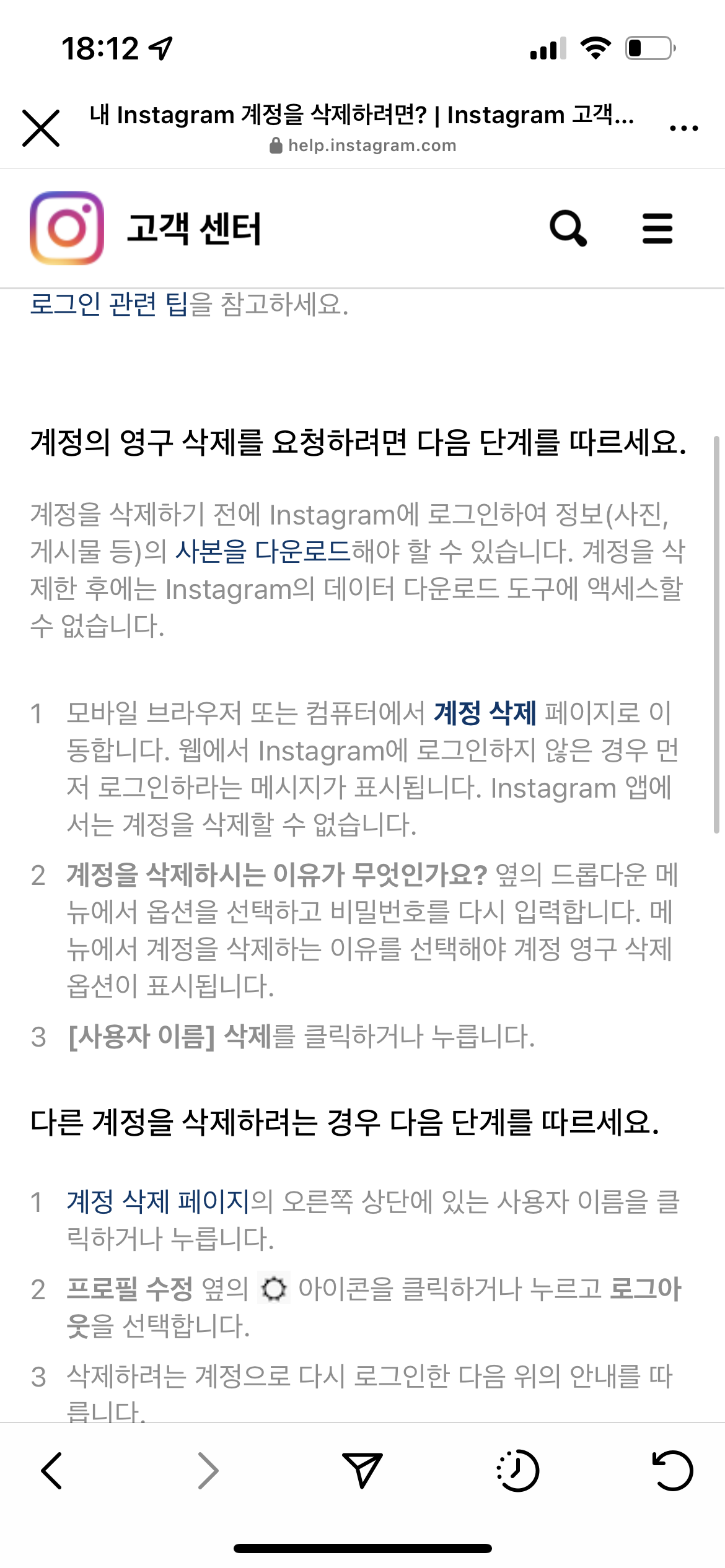 인스타그램 계정 탈퇴를 위해서는 '계정삭제'가 아니라