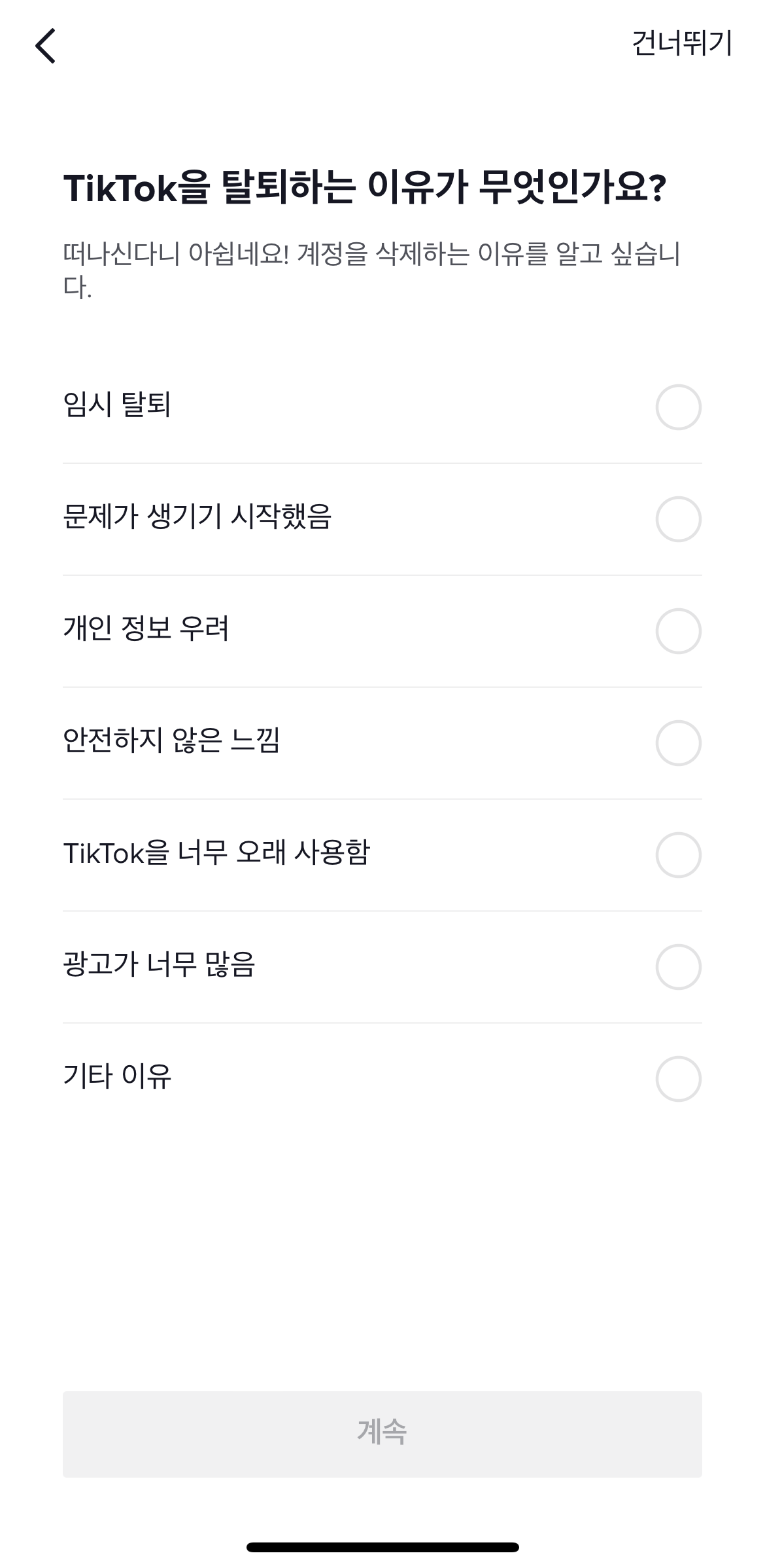 최근 틱톡 뿐만 아니라 유튜브 숏츠, 인스타그램 릴스 라는 대체제가 있어서 틱톡에서 보내는 시간이 현저하게 감소하였습니다. 용량만 잡아먹고, 개인정보 유출이라는 고민을 하기보다는 틱톡 어플 탈퇴와 삭제를 하는 것이 더 낫다고 판단하였습니다.