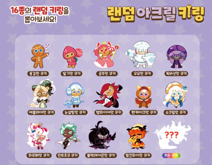 쿠키런 킹덤 랜덤 아크릴키링 16종의 라인업은 위 사진과 같습니다.