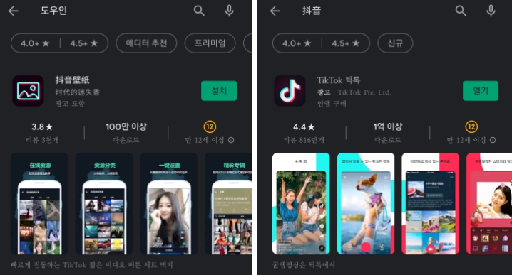 My phone is Android, so I'll explain it based on Android. TikTok, tikTok, Dowin,抖 모두 Even if you search for all of them on Android's Play Store, only Korean TikTok comes out and other applications come up. You can't get the application from the Play Store and Galaxy Store, but you have to download it separately.