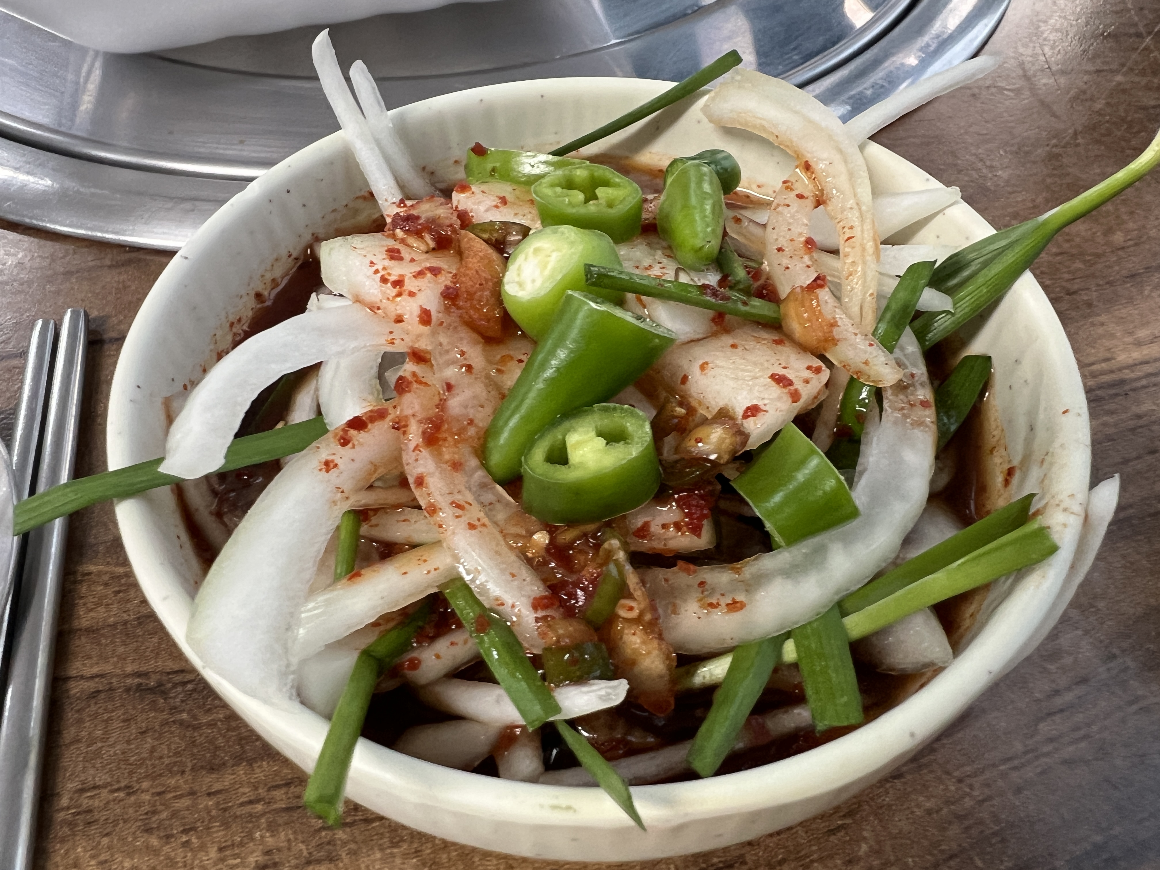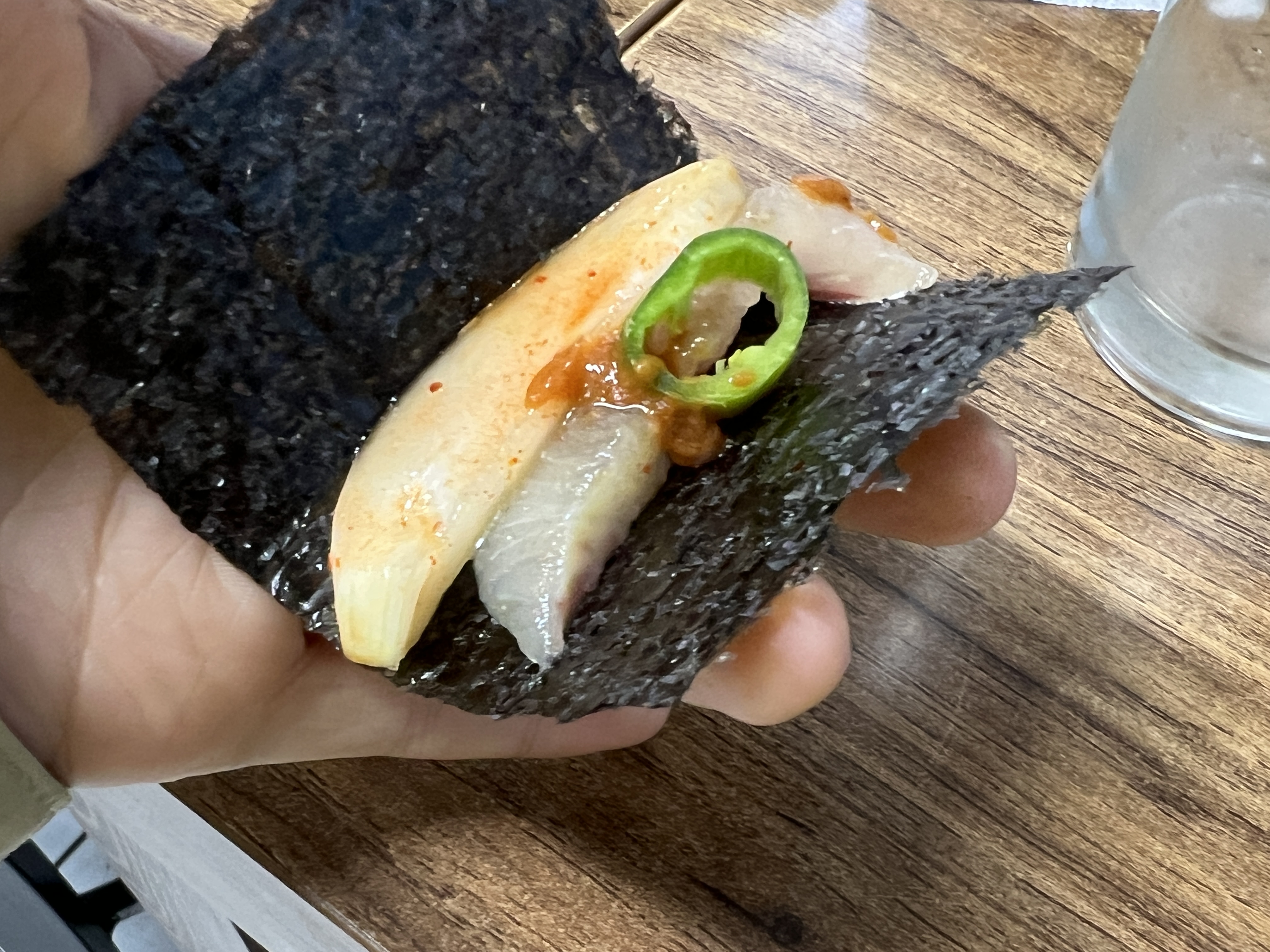 기본반찬도 실하고 맛있었어요. 함께 나오는 양파 초절임이 고등어회와 너무 잘 어울렸는데요. 김 위에 고등어 회를 올리고, 양파초절임을 올려서 먹으면 조화가 장난아니랍니다.