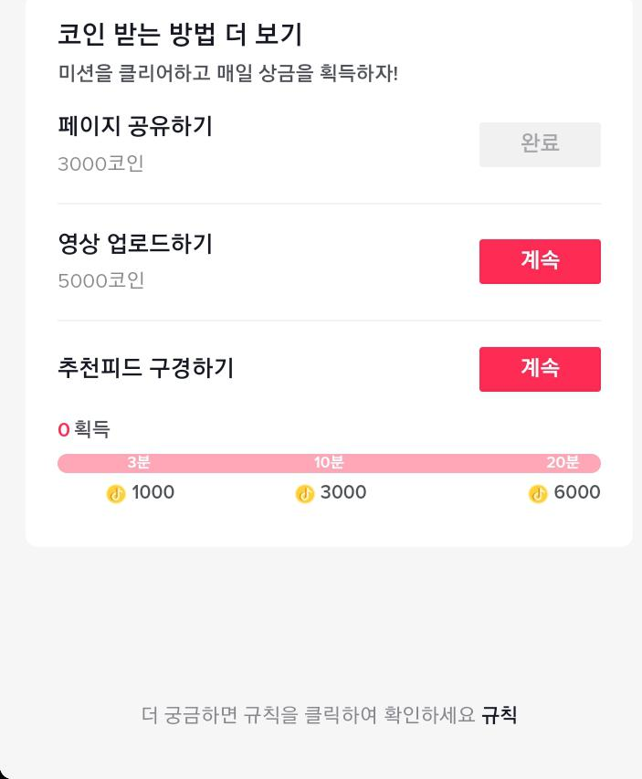 이걸 클릭하면 페이지를 공유하거나/영상업로드/추천피드 20분 구경하면 코인이 들어온답니다.