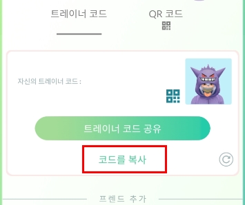 포켓몬고 어플로 들어가서 트레이너 코드에서 자신의 트레이너 코드를 복사합니다.