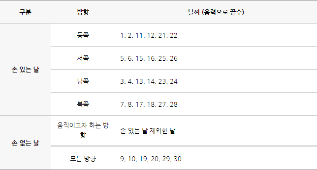 동, 서, 남, 북 이렇게 돌아다니고, 하늘로 올라가는 날 손이 없다고 하는데요. 우리나라의 민간 신앙에서는 이사를 할때 아니면 멀리 떠날때 (외국 갈 때) 손 없는 날을 선택하고 방향을 택해서 이사를 하곤 합니다.