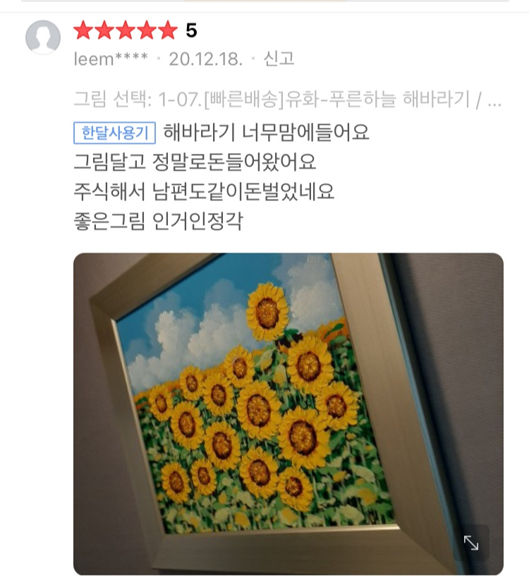 친구가 보내준 해바라기 그림 후기를 보면 해바라기 그림이 온 이후로 주식도 잘 오르고, 재물운이 들어왔다는 후기가 정말 많았습니다. 친구는 이날 바로 해바라기 그림을 구매 했는데 저 그림이 6만원이나 하더라구요..? 저는 비싸서 아직 구매는 안했지만 이사 갈 집에 걸어놓을 생각입니다.