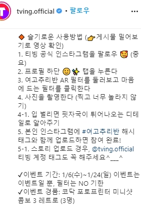 최근에는 티빙 공식 인스타그램에서 AR필터를 찍고 인스타그램에 업로드하면