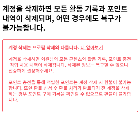 계정을 삭제하면 모든 활동 기록과 포인트 내역이 삭제되며
