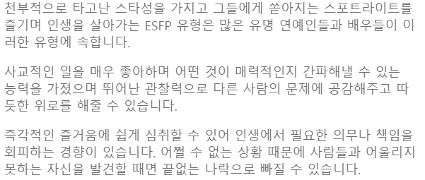 기존에 MBTI검사를 했을 때 나왔던 거랑 하나가 다르지만 거의 비슷한 것 같았어요.