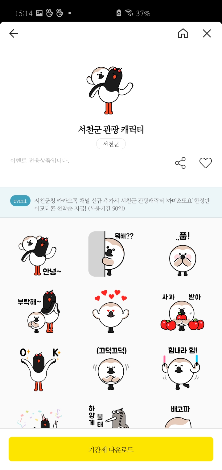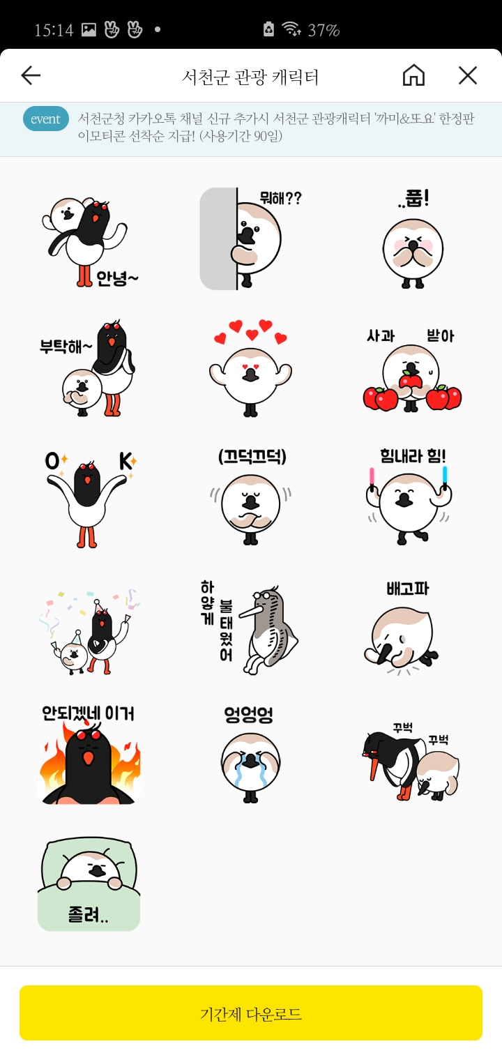 요즘 보통 30일 무료 이모티콘만 나오는데 90일 이모티콘이 나와서 부랴부랴 다운 받았어요.