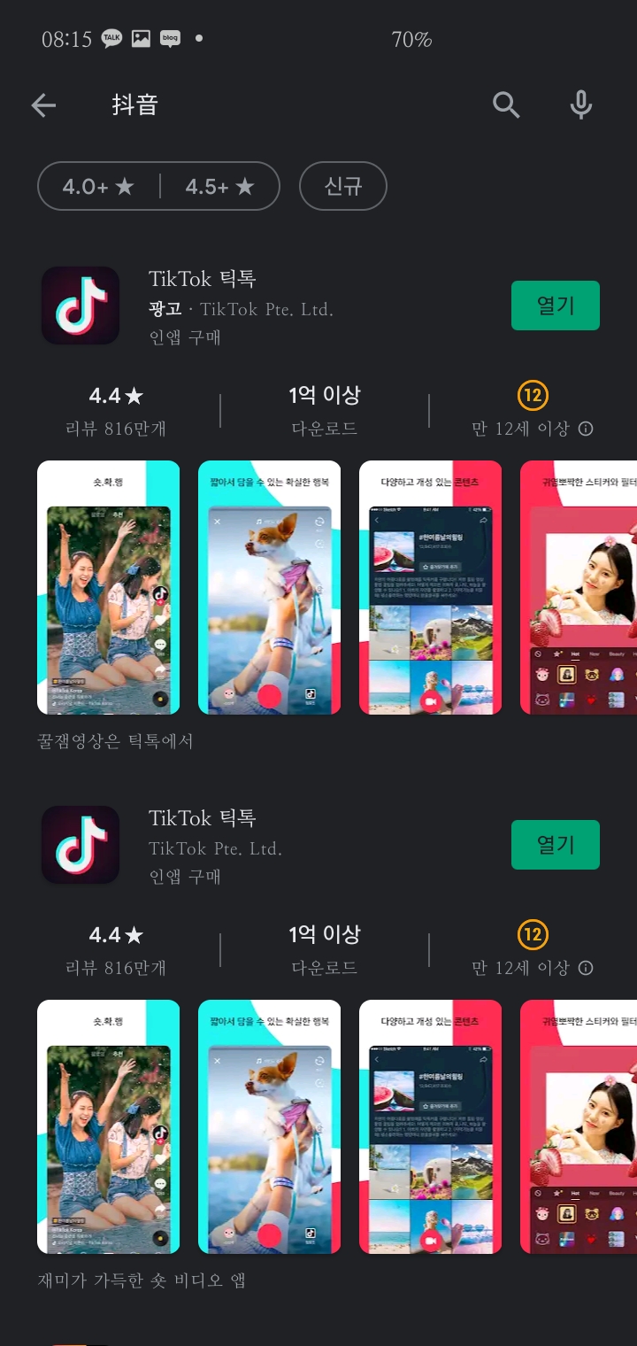 제 폰은 안드로이드이기 때문에 안드로이드 기준으로 설명드릴게요. 안드로이드의 플레이스토어에 틱톡, tictok, 도우인,抖音 모두 검색해도 한국틱톡만 나오고 다른 어플이 다오곤 합니다. 어플을 플레이스토어, 갤럭시스토어에서 받을 수는 없고 별도로 들어가서 다운을 받으셔야해요.