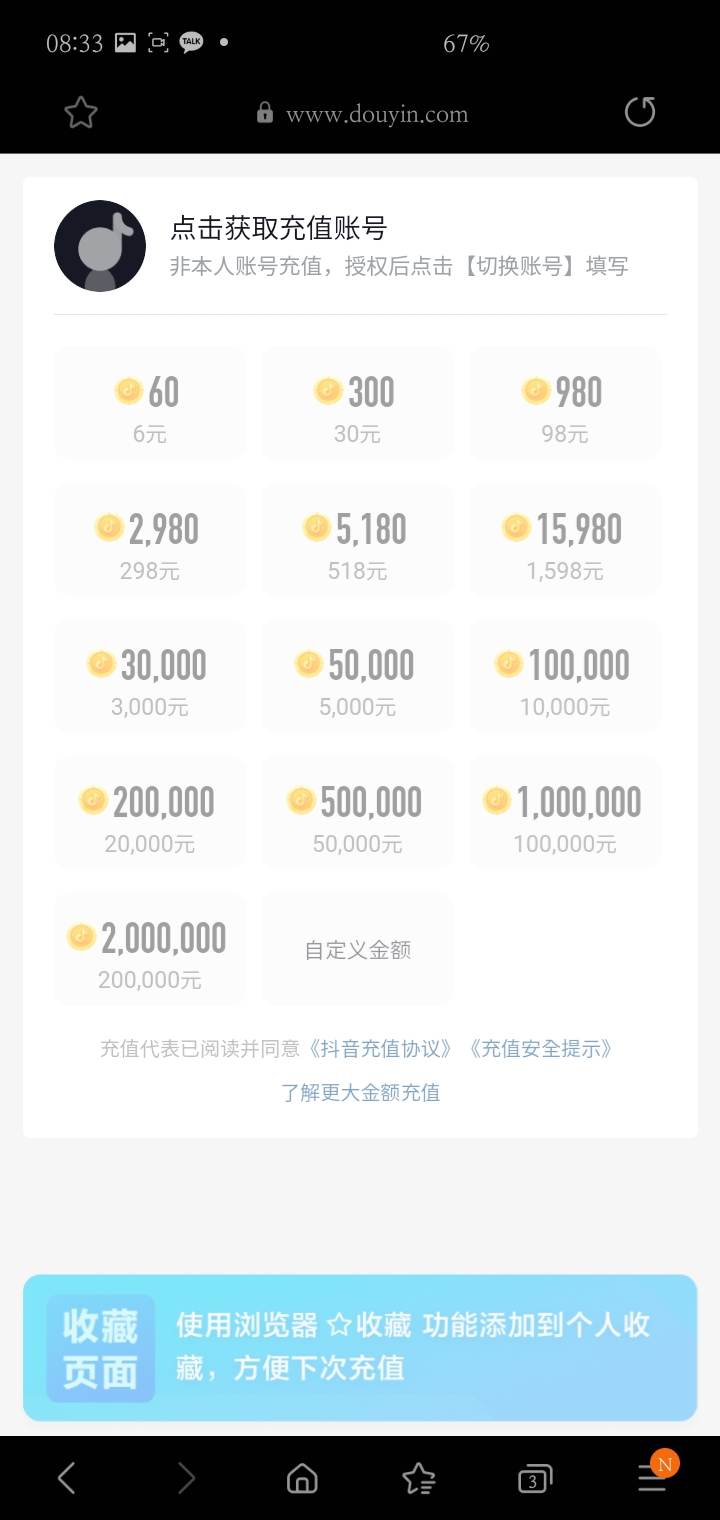 도우인 페이지에는 이렇게 돈을 충전하는 페이지도 있습니다. 이게 한국과 다른 점이라고 생각이 들었어요. 한국 틱톡은 틱톡내부에서 후원하는 것이 없는데, 중국은 별풍선 쏘는 것처럼 라이브에 선물을 보낼 수 있더라구요. 파파고로 번역을 해보니까 계좌를 연결하고 충전하는 걸로 보였어요. 아래는 즐겨찾기에 추가하라는 말입니다.
