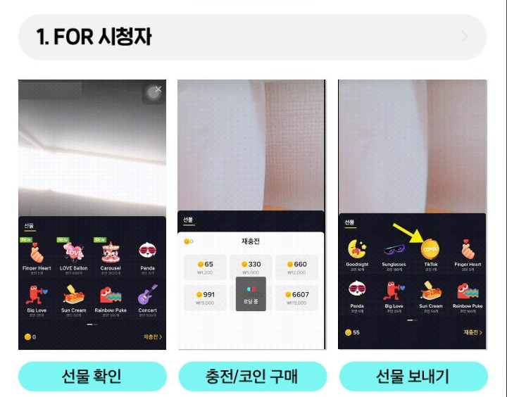 시청자들은 선물의 종류를 확인해서 코인을 충전하고 선물을 보낼 수 있습니다.