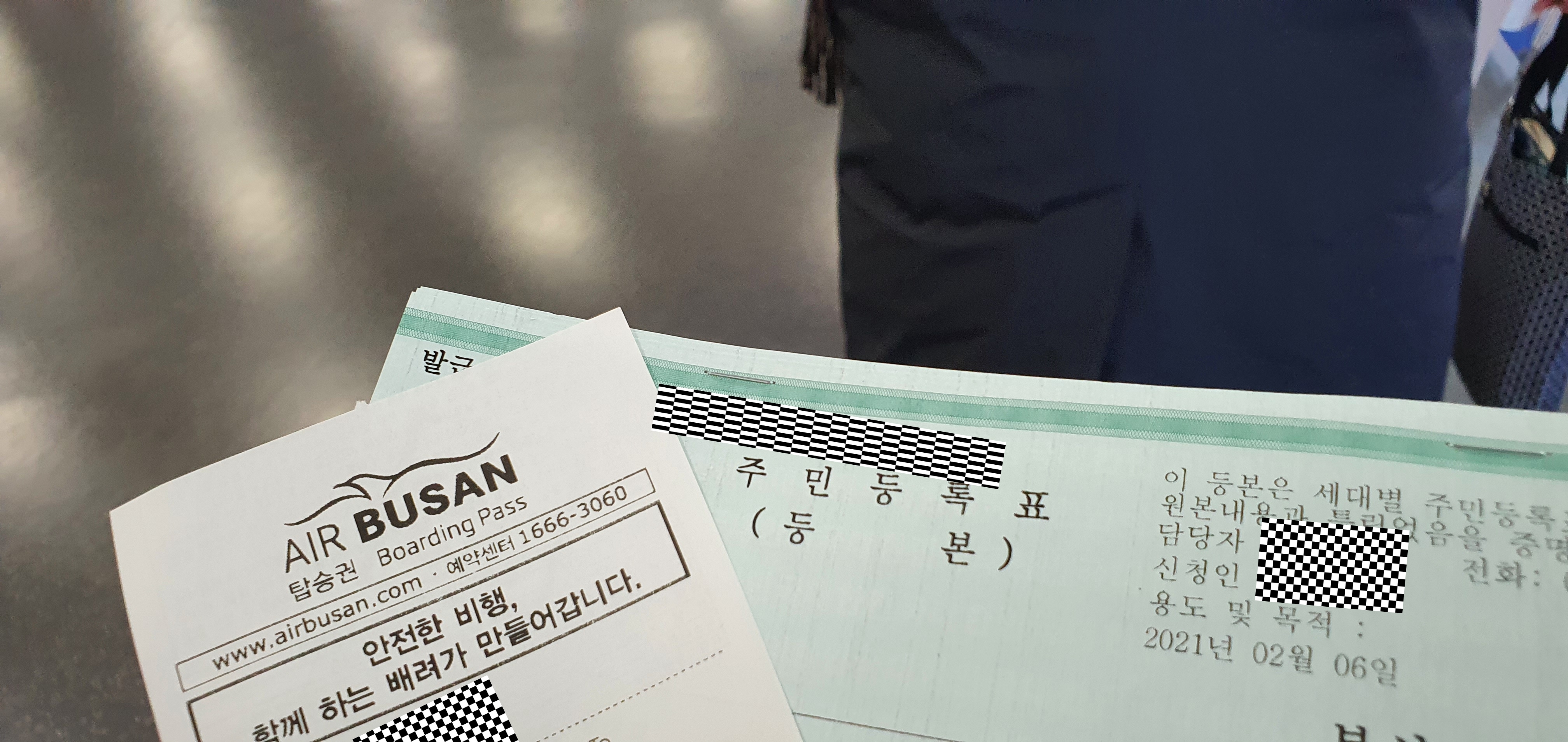해결방법은 바로 공항에 비치된 무인민원 발급기에서 주민등록등본을 출력 후 탑승하는 것입니다. 하지만 무인민원 발급기도 그냥 발급만 하면 되는 것이 아닌, 승무원 담당자분을 동행해서 같이 발급을 하고 내 등본이 맞는지 확인 후 손목에 띠를 채워줍니다.