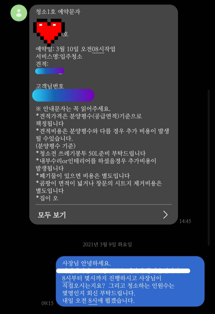문자를 하고 양식에 맞춰서 예약을 한 후 별다른 연락이 없다가 입주 청소 2~3일 전에 문자가 왔어요.