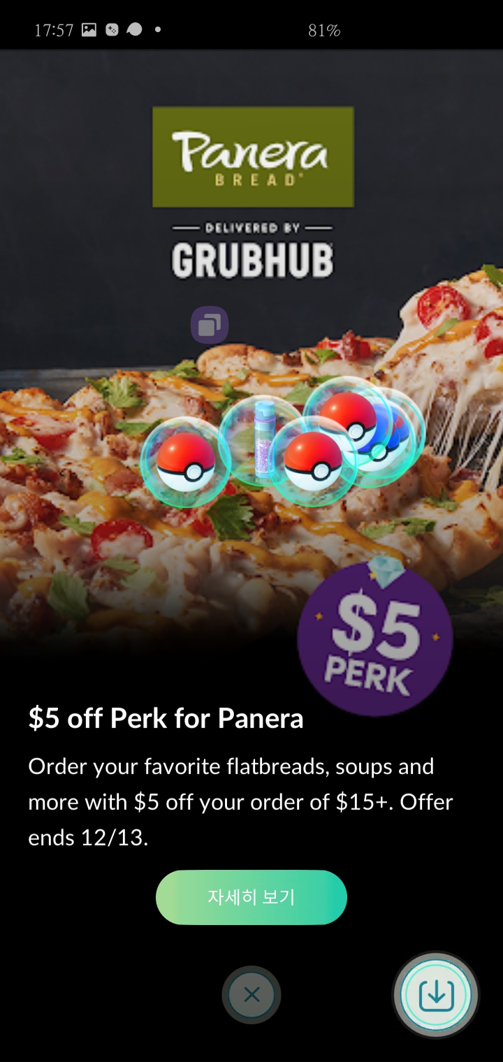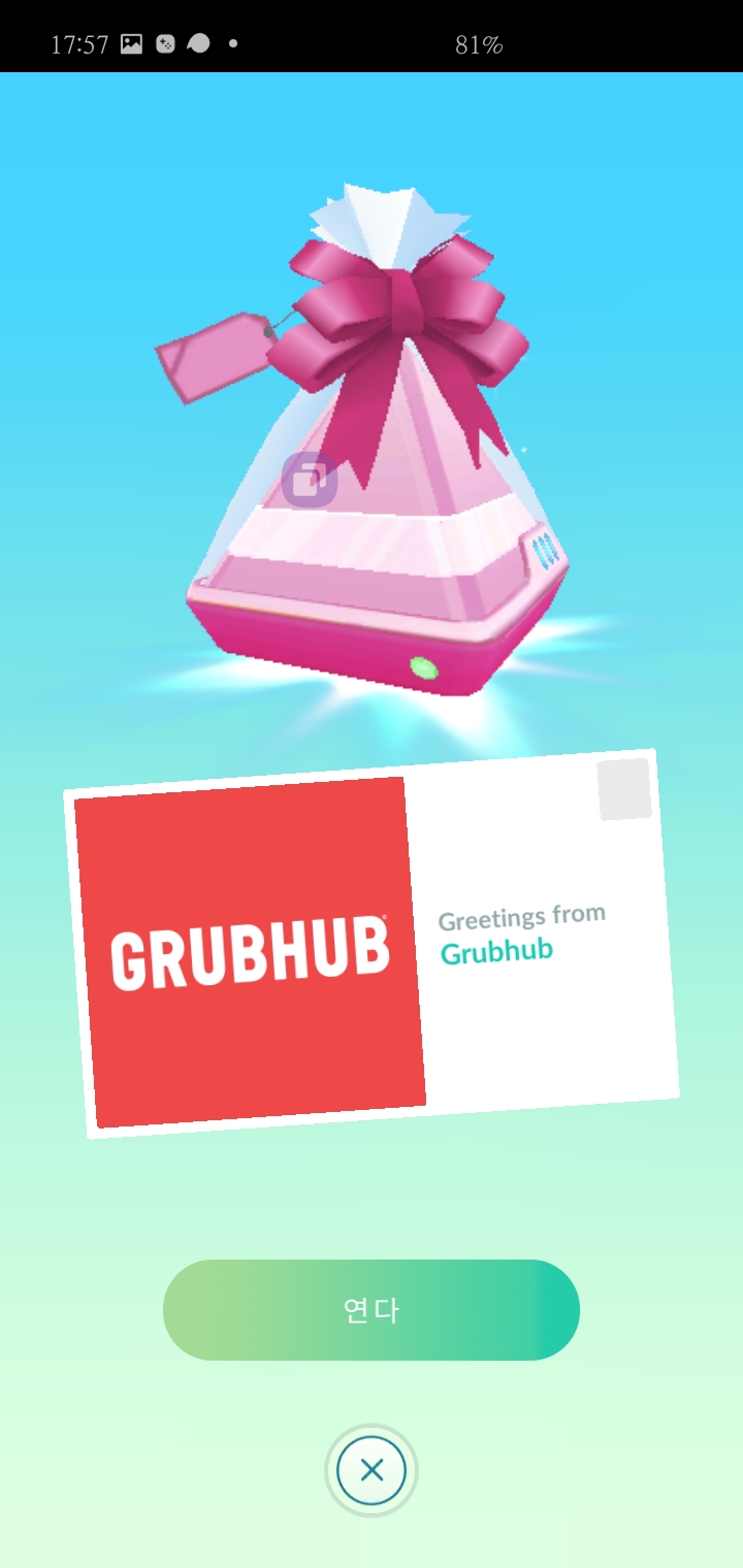 grubhub 포켓몬고 스폰서 선물 이었습니다. grubhub는 미국 ? 글로벌 1위 음식배달 기업이라고 하네요. 몇월 며칠까지 어떤 매장에서 포장배달을 이용하면 5퍼 할인 이라는 것 같습니다.