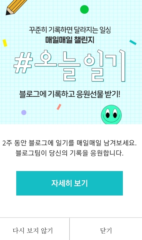 네이버 블로그 어플 들어가면 14일 동안 매일 기록 남기고