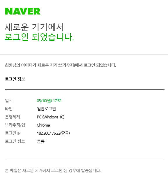 어느날 회사 메일로 새로운기기(브라우저)에서 로그인 되었습니다. 라는 메일을 받았습니다. 이 메일은 딱 보면 내 네이버 아이디로 다른 누군가가 로그인을 했나 ? 하는 생각이 들게 하는데요. 평소 네이버 로그인을 자주 하고 회사 메일과 연동해놓은 네이버 아이디가 없었기에 의심부터 했습니다.