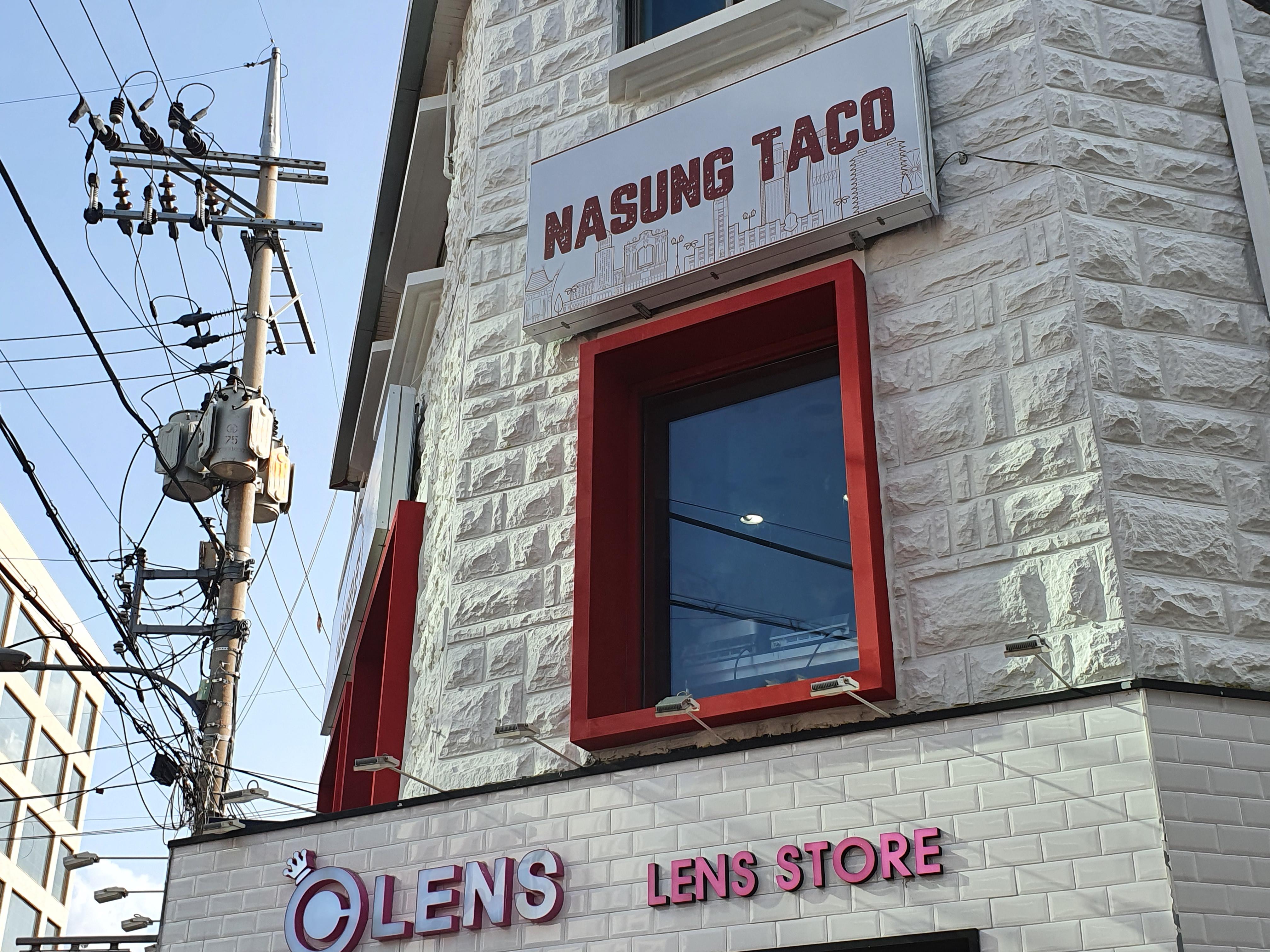 나성타코의 위치는 구 미미네 떡볶이 있는 위치에 있습니다. 2층에 위치하고 있는데요. 흰색의 배경에 전체적으로 창틀과 포인트를 붉은 빛을 두어서 멀리서도 눈에 잘띄는 이미지입니다.